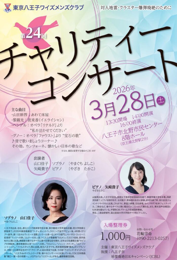 対人地雷・クラスター爆弾廃絶を訴え毎年おこなわれている東京八王子クラブのチャリティーコンサート。24回目を迎える今年は3月28日(土)八王子市北野市民センター8階ホールにて開催されます。